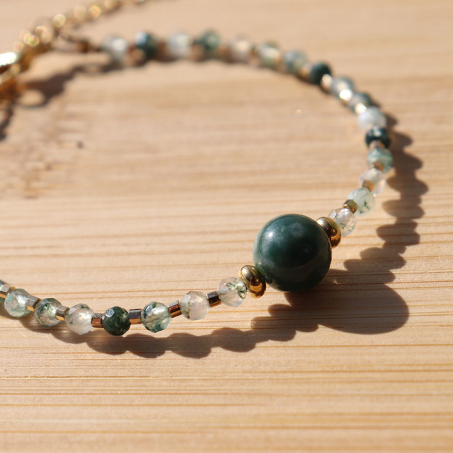 🛠️ Perles d’agate verte et agate mousse aux nuances de vert, perles Miyuki dorées et rondelles en acier inoxydable doré (316L).