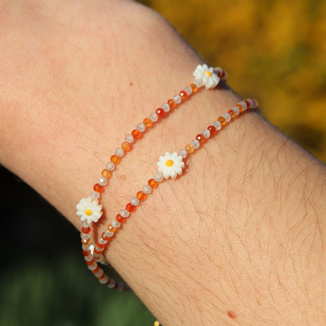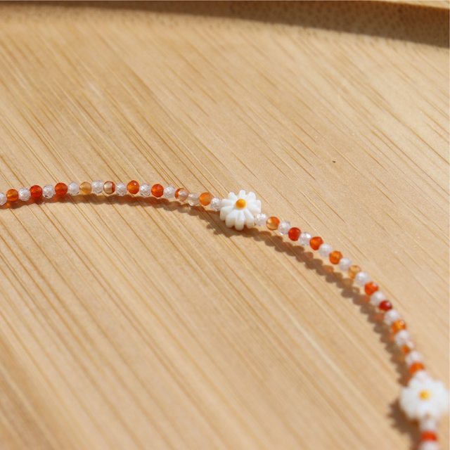 🛠️ Nacre naturelle, perles de cornaline et oxyde de zirconium, le tout assemblé à la main avec minutie.