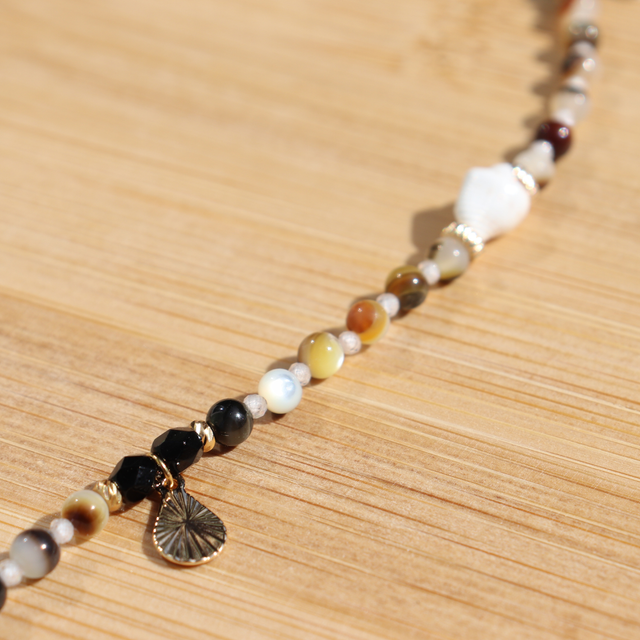 🛠️ Pierres fines, nacre et coquillages naturels, rondelles et pendentif en laiton doré à l’or fin 24K monté à la main.