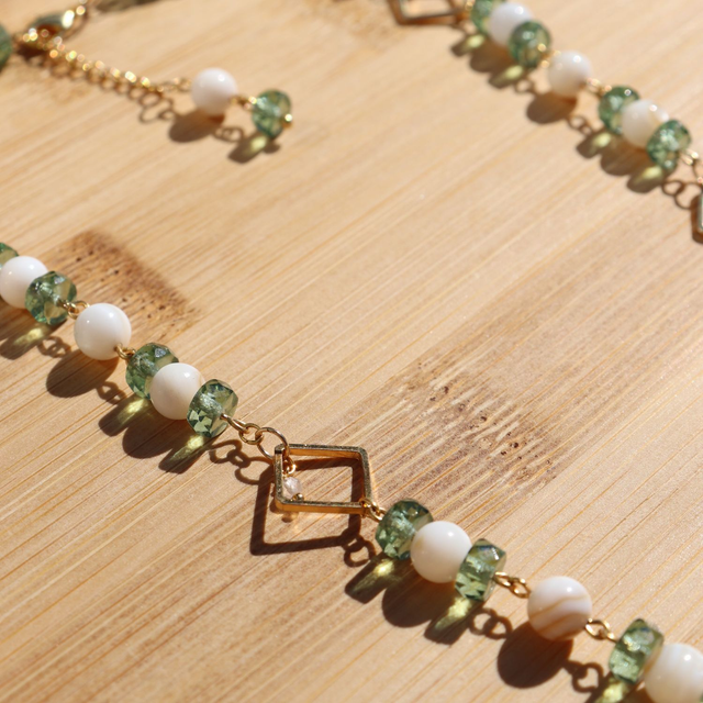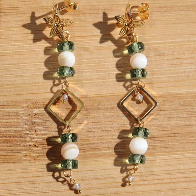 🛠️ Chaque bijou est monté à la main, en associant avec soin des perles de Bohème, de la nacre naturelle, de petites pierres fines et des éléments dorés en laiton 24k.